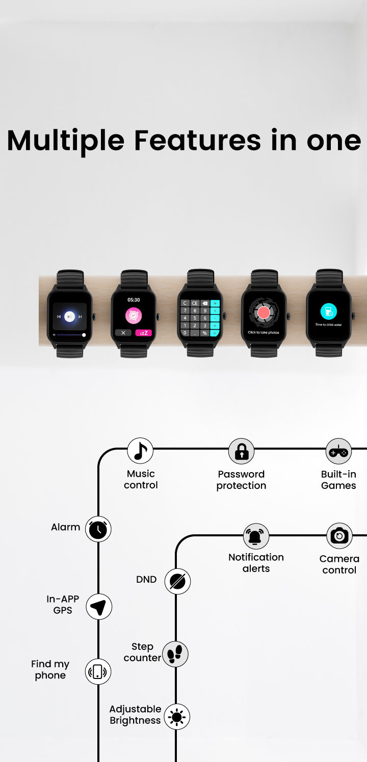 provides various features such as in-built games, theater mode, split screen function, In-app GPS, Raise to wake feature, Find my phone, and instant voice assistant.