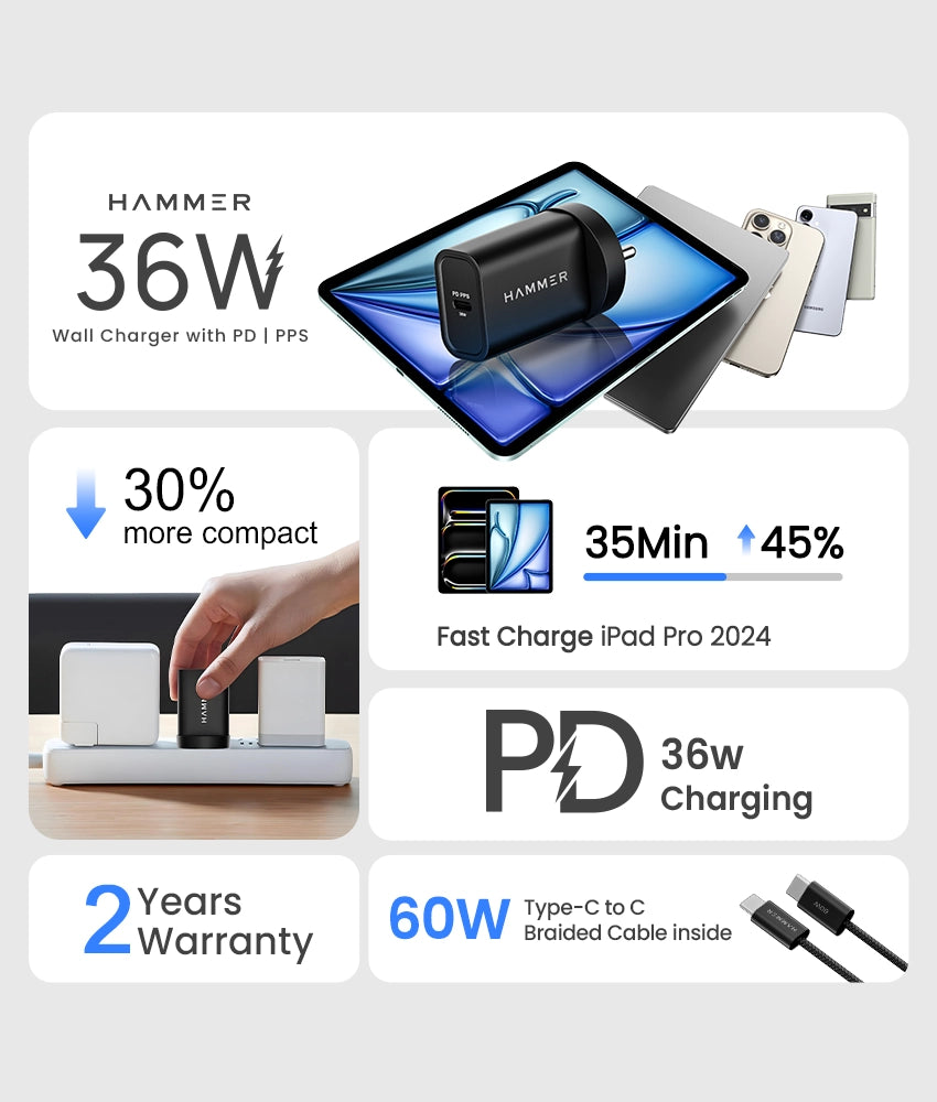 Power up smarter with the Hammer 36W Wall Charger, designed for today’s fast-paced lifestyle. Featuring Power Delivery (PD) and PPS technology, it delivers optimized, efficient charging for all your devices—whether it’s the latest iPhone, iPad Pro 2024, Android smartphones, tablets, MacBook Air, or other USB-C gadgets.