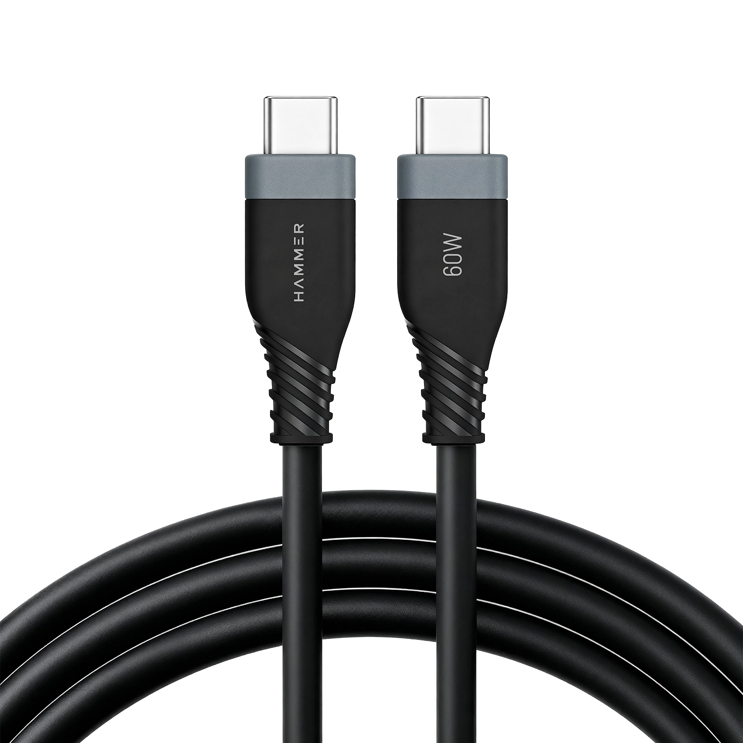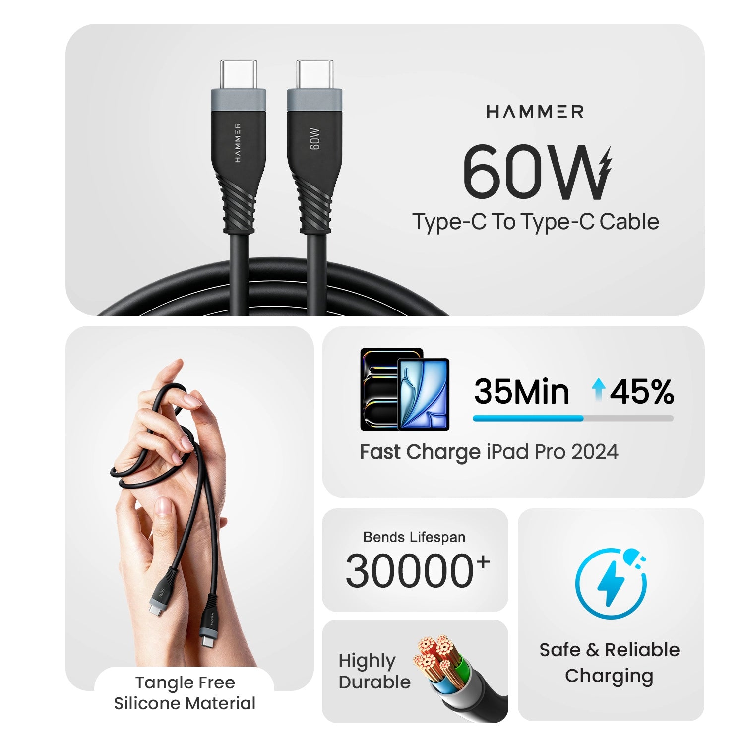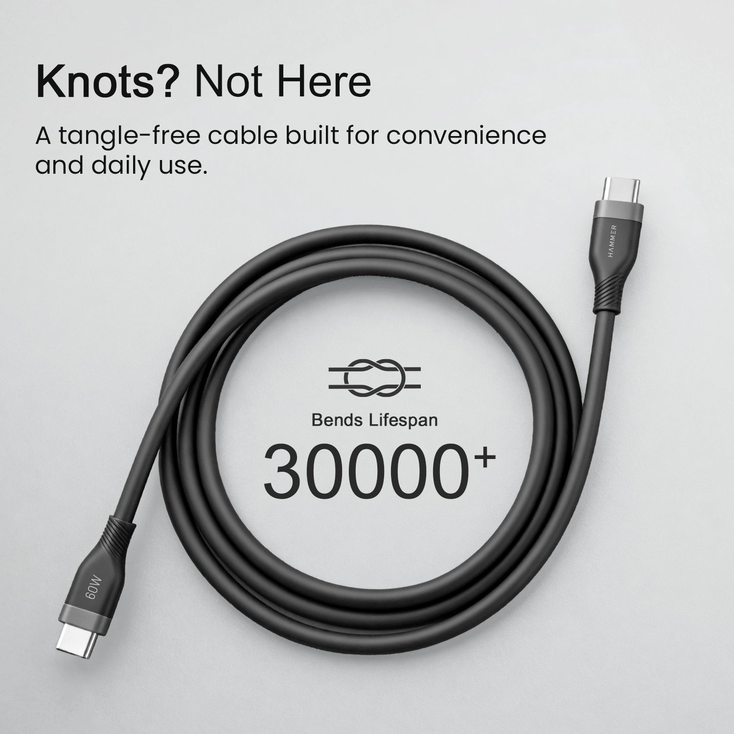 Hammer Type C to Type C Cable 60W Silicone Cable, Data Sync, Compatible with all C-Type Enabled Devices (Black)